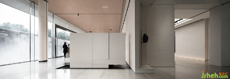 櫥窗式“框景”,一方面破除里外的分界,同時(shí)建立起里與外的銜接;另一方面所“框”之景暗合曲水流觴的敘事,觸發(fā)觀者對空間的思考和探索的興趣。園林通過玻璃幕墻滲透到建筑的內(nèi)部,建筑懷著開放的姿態(tài)將自身向景觀敞開,彼此互為映襯,相得益彰。