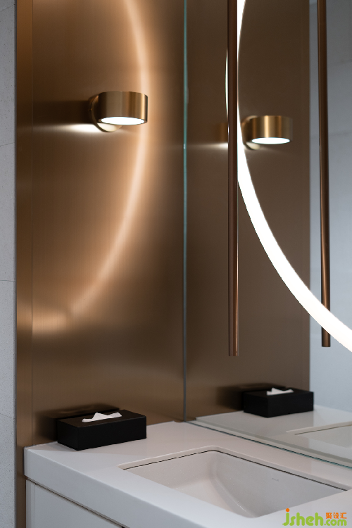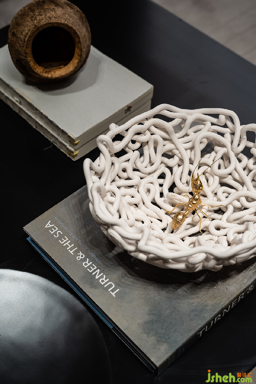 泉眼潺潺,曲渠鱗鱗,與室外的池景連成一片水域。售樓處設計釀黃酒的稻米與重達數噸的黑山石安置室內,傳遞關于時間的詩意。浪淘猶見天紋在,一石攬盡太古風。巖石的肌理藏著時光流逝的聲響與印痕,潛移默化將觀者帶入意境之中。