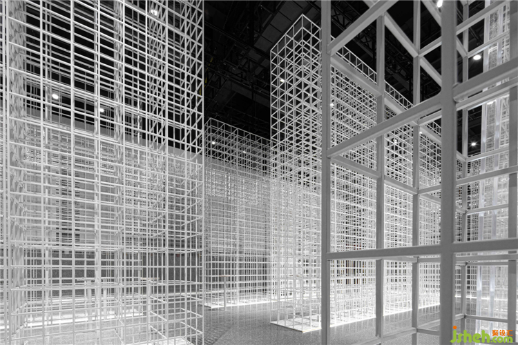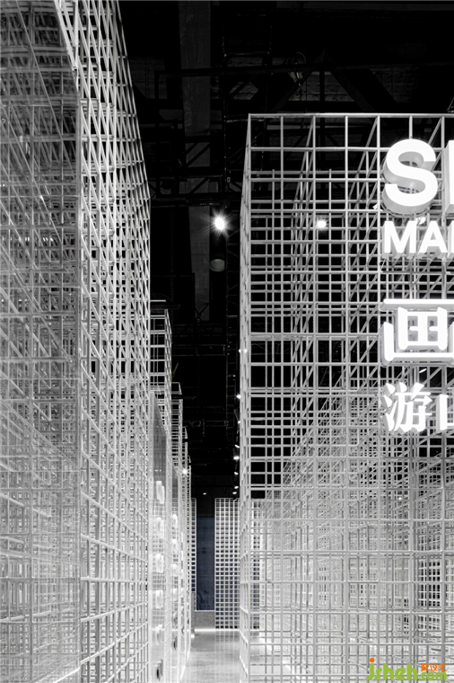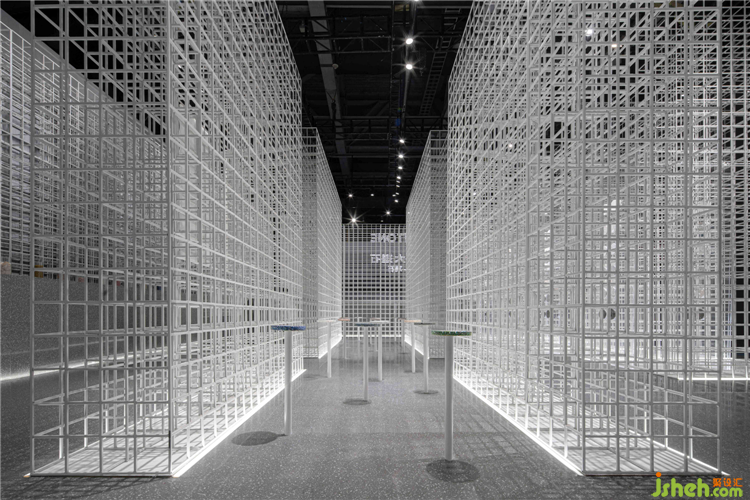 我們將鋼網(wǎng)矩陣作為展廳的基礎(chǔ)元素,以一種交接構(gòu)造呈現(xiàn)出最低限度的語言。這些縱橫的編織形態(tài)力學(xué)結(jié)構(gòu)簡(jiǎn)明,密集的疊合關(guān)系在視野上形成一種遮罩,結(jié)合運(yùn)動(dòng)中的視線形成線性流動(dòng)的視覺效果。不同厚度層層遞進(jìn),如細(xì)胞到組織、組織到器官、器官到生物體,給人形而上的想象。