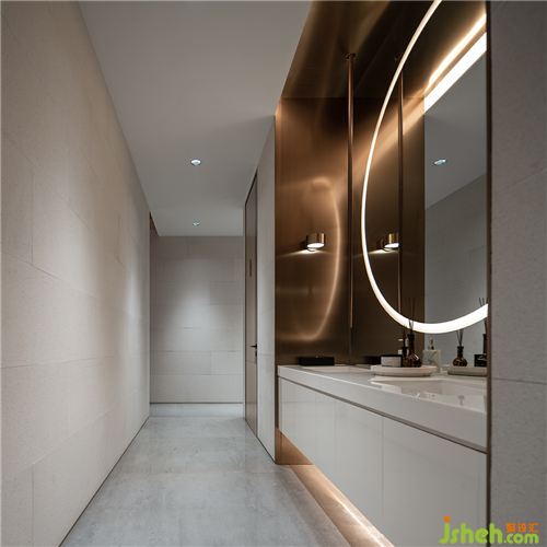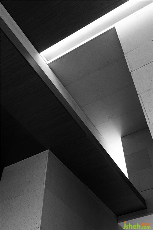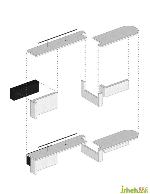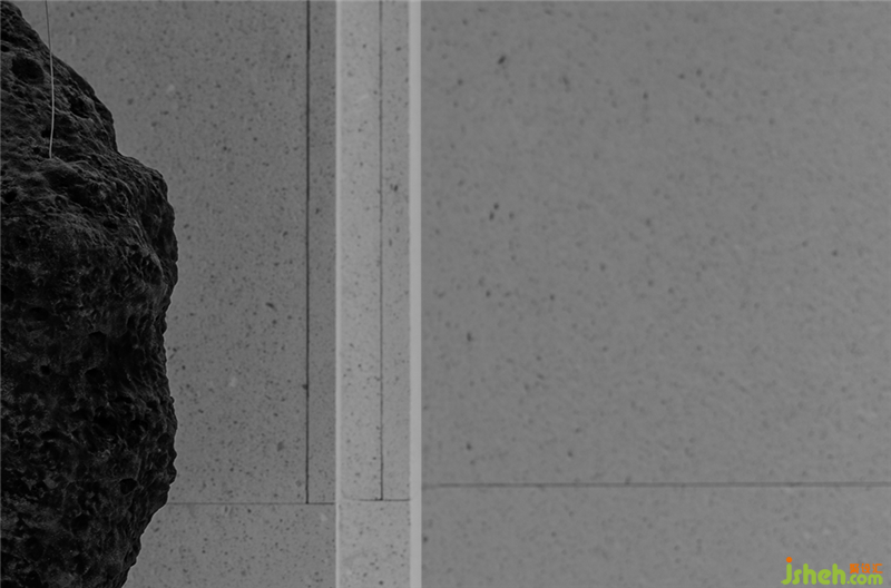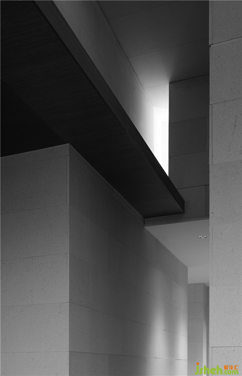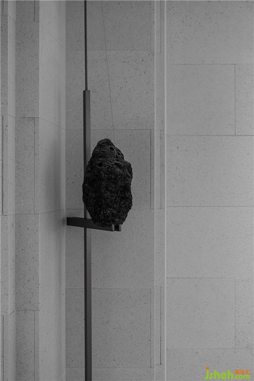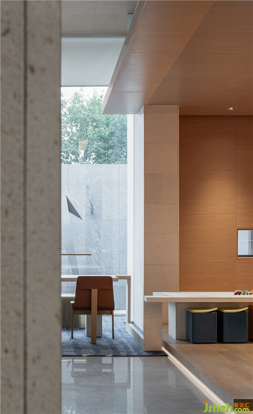 從原石,到半成品石,再到人造石板,銷售中心設(shè)計師以材料建立起三重時間的演進(jìn)。接待臺的磚體晶瑩里泛一點(diǎn)黃,如同稻米映照在陽光之下。磚體相對脆薄,采用室內(nèi)裝修的手法拼砌,磚體必不能承其重,因此改用建筑手法排砌,意外使得磚體質(zhì)感更顯。走廊轉(zhuǎn)角處,設(shè)計師原想開一個面東的天窗,讓光影可以流轉(zhuǎn),囿于客觀條件未能實現(xiàn)。改而研發(fā)出一種水泥板,以創(chuàng)造從明亮到柔和的漫反射光線。水泥板采用交錯咬合的方式搭砌,交接處可清晰見到材料的厚度。