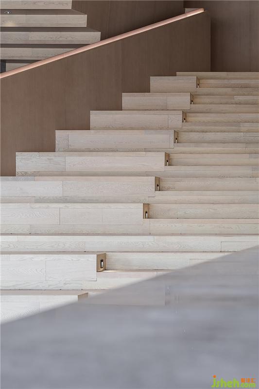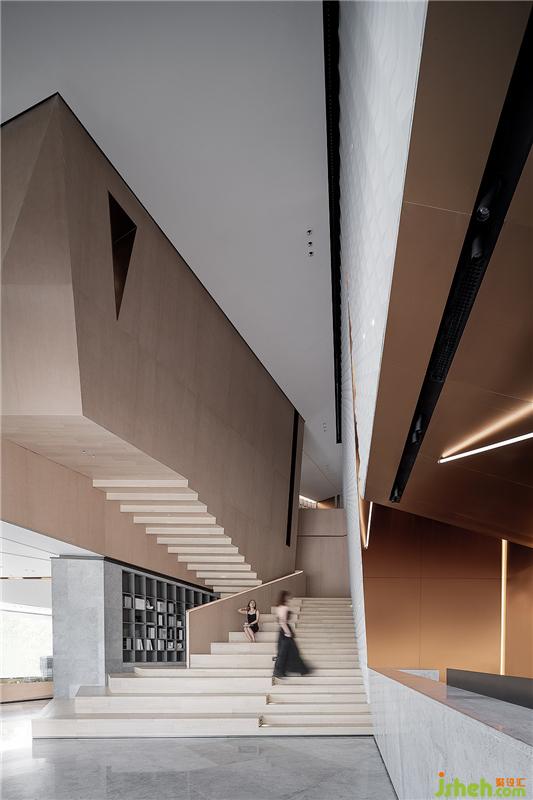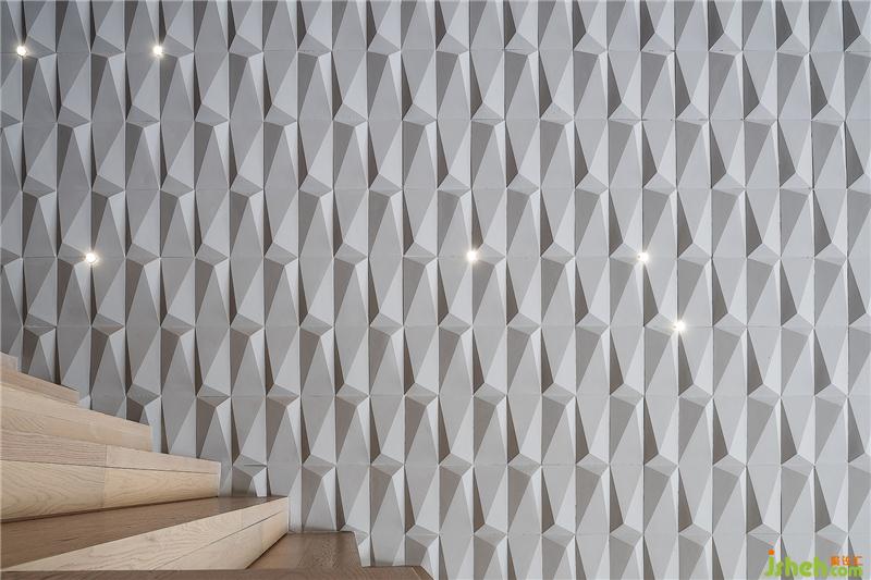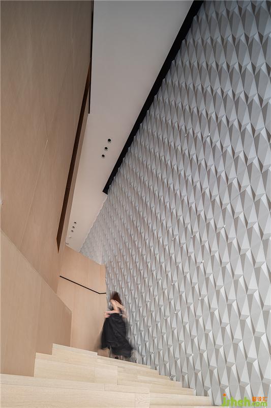 整個(gè)接待區(qū)域的墻面如折紙模型般含吮著光線,淺色水泥材質(zhì)以起伏制造出有如折痕的明暗。