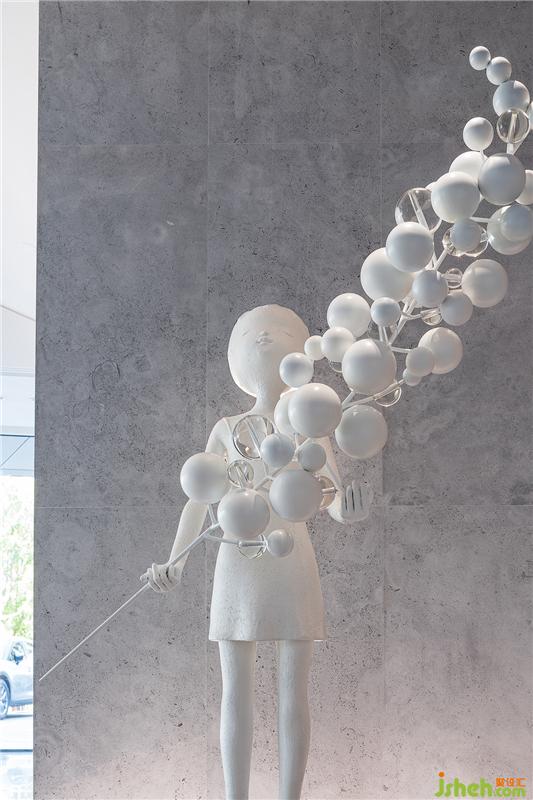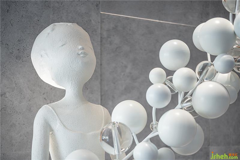 和某種邏輯相似,亦或是空間的嵌頓,對峙的氛圍間,接待臺的材質(zhì)讓空間裂隙中的用色趨向于漫射的自然光和幽微的燭光之間,結(jié)合追光少女裝置輕盈的形態(tài),成為空間中最溫存的所在。
