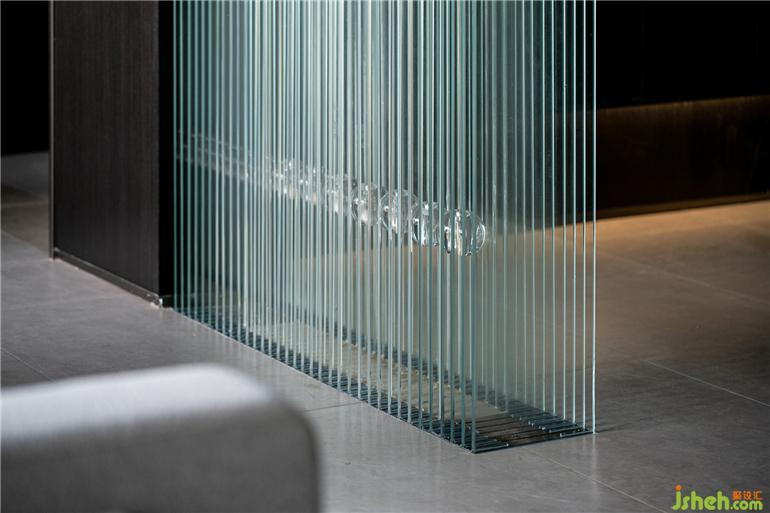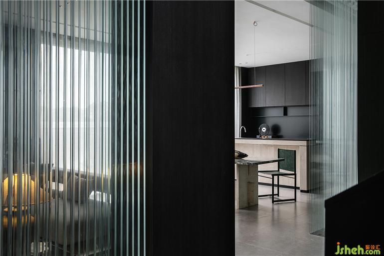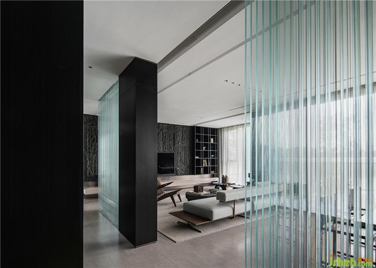 客廳中玻璃的輕盈與石材的厚重形成主要的視覺對撞,粗糙與光滑之間揉合了傳統(tǒng)園林中關(guān)于 “石壁“與“瀑布”的直覺與想象。