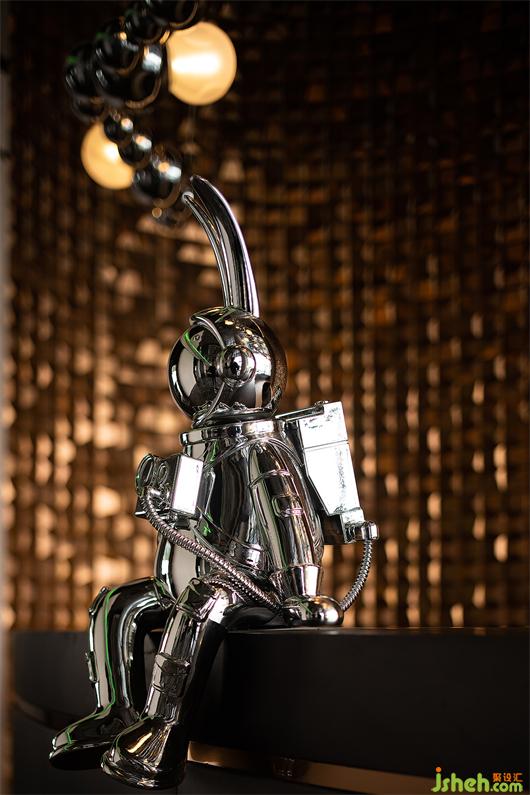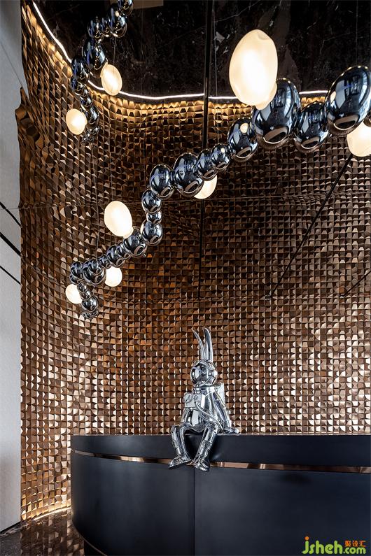 上到十五層,首先要經(jīng)過一個(gè)藝術(shù)長(zhǎng)廊。深邃的太空灰為頂,圓形孔洞在頂面上方以陣列的方式延伸向前。