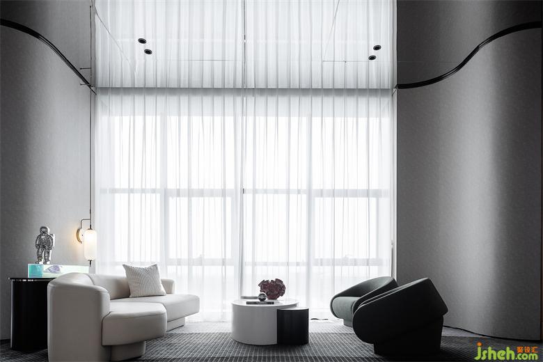 營(yíng)銷中心設(shè)計(jì)座椅的擺放布局,呈現(xiàn)靈活且豐富的形態(tài),一改傳統(tǒng)售樓處一排散座的僵硬感,自然而然地呈現(xiàn)出應(yīng)有的社交性,召喚著人在空間中的參與感。因?yàn)閷痈叩南拗?,設(shè)計(jì)師通過天花鏡面材料改變空間狹長(zhǎng)的姿態(tài),強(qiáng)調(diào)著窗邊造型柱的秩序感,制造著漂浮且沒有摩擦力的體驗(yàn)。
