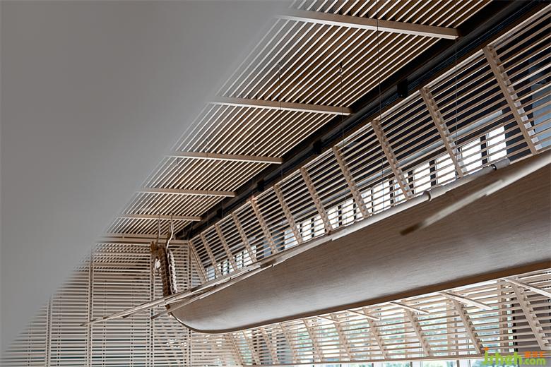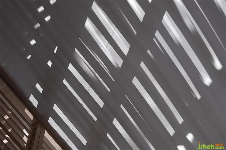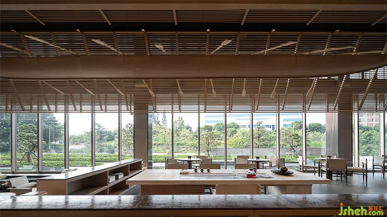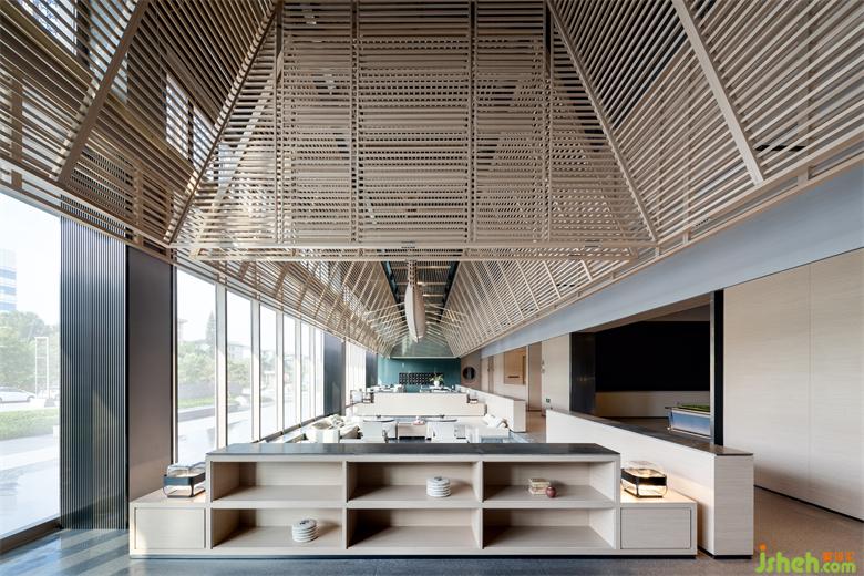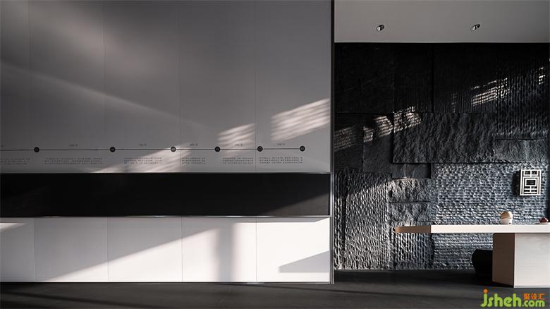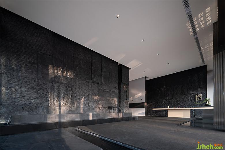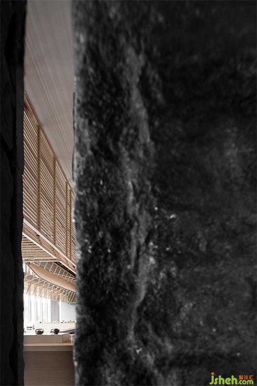 從門(mén)廳的巖間潺潺流水開(kāi)始,體驗(yàn)的基調(diào)變得安靜。循著彌散的茶香、琴音,巖壁上開(kāi)鑿的肌理交錯(cuò)并置,石的斑駁穿越時(shí)間裂隙,和鳴成曲。簡(jiǎn)化的疊石、筑山、理水概念將“空”隱逸于石林水澤之中。隨行進(jìn)軸線展現(xiàn)的是隱逸都市的茶室場(chǎng)景,營(yíng)銷(xiāo)中心設(shè)計(jì)整個(gè)空間是徐徐展開(kāi)的狀態(tài),與自然的關(guān)系進(jìn)一步延伸至材料層面。