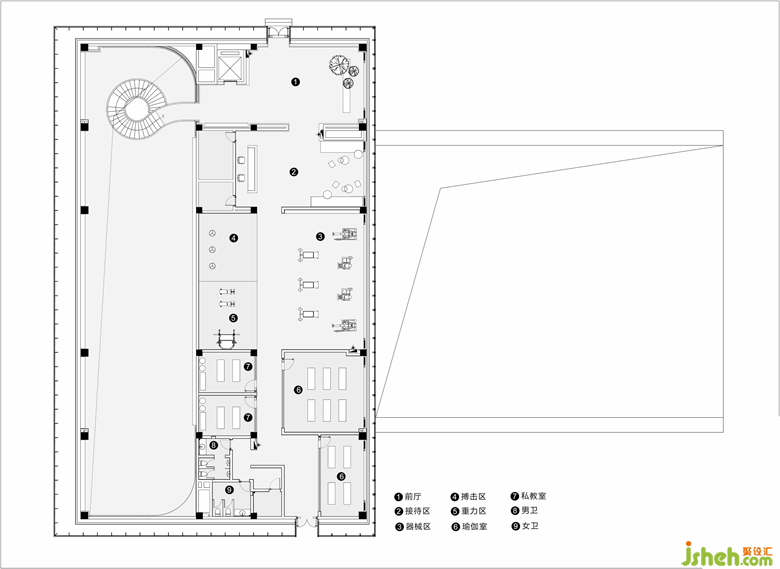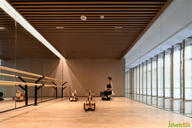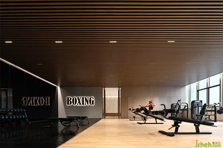 在健身區(qū)的設計中,大面積的自然采光配合各區(qū)域不同健身主題的背景墻,再輔以頂部線條的運用,營造出一種緩緩流動的秩序感,在簡單的符號語言之間,講述空間的精神與狀態(tài)。