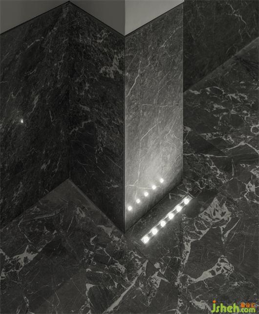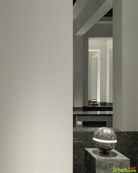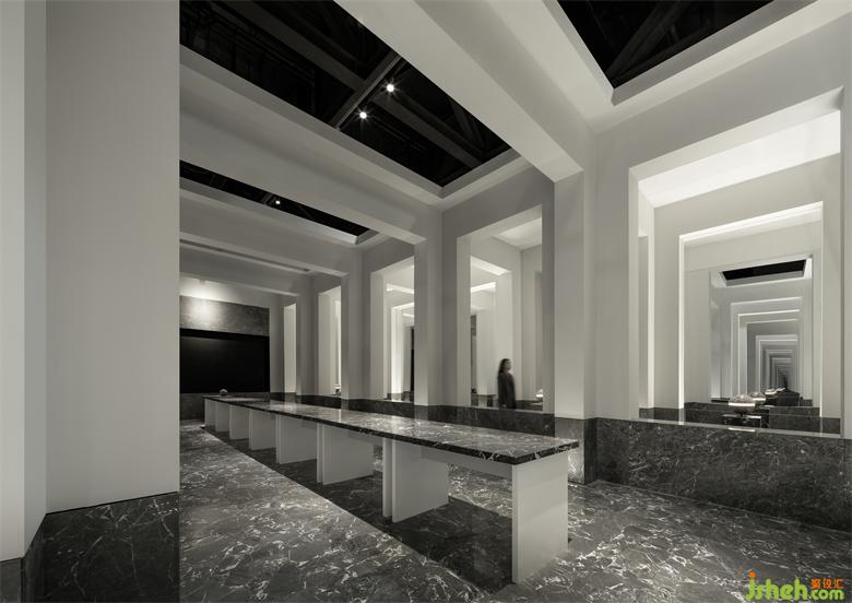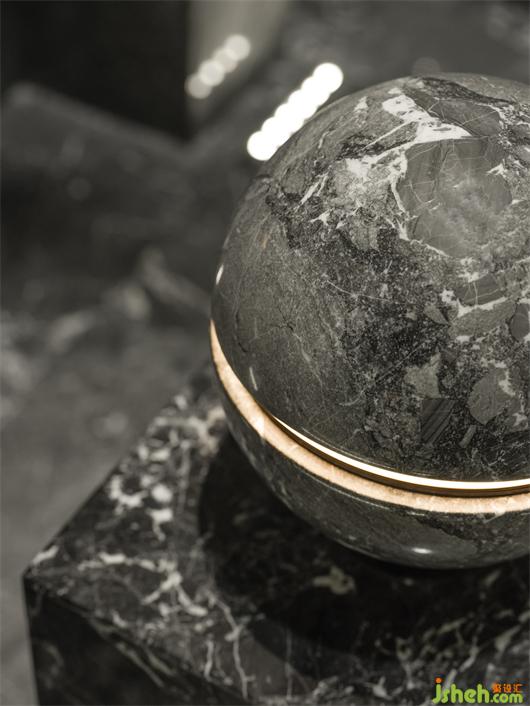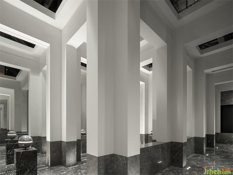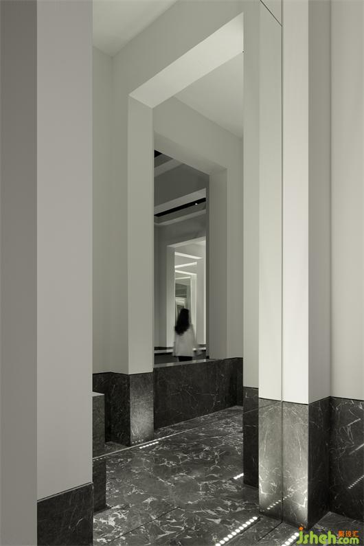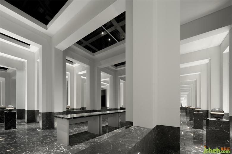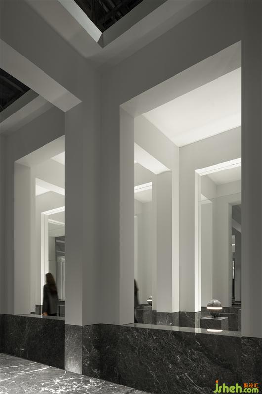 受帕特農(nóng)神廟空間構(gòu)成的啟示,展廳平面的核心空間與外圍廊柱形成一種神圣的陣列,展廳設(shè)計(jì)中軸對(duì)稱的布局展現(xiàn)出豐富的空間層次。行進(jìn)流線區(qū)域間放置的大理石裝置對(duì)應(yīng)著石材的未來感,在框景之中,為空間與人的交流、互動(dòng)罩上一層神秘色彩。