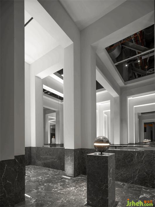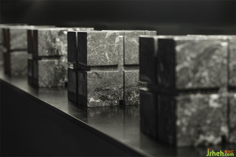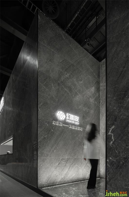 大理石為整個(gè)場景奠定著基調(diào)。空間內(nèi)部建構(gòu)上半部分的淺對(duì)應(yīng)下半部分的深,展廳設(shè)計(jì)幻影灰石材由地面上升、包圍,削弱了結(jié)構(gòu)下半部分的存在感,讓整個(gè)空間變得深邃而輕盈。