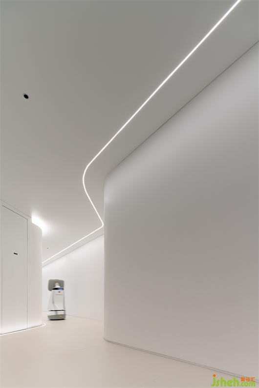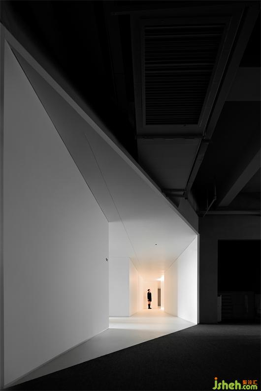 The white box is by no means a single spatial form here. Located in front of the L-shaped corner of the public office corridor, it forms a white tea room.