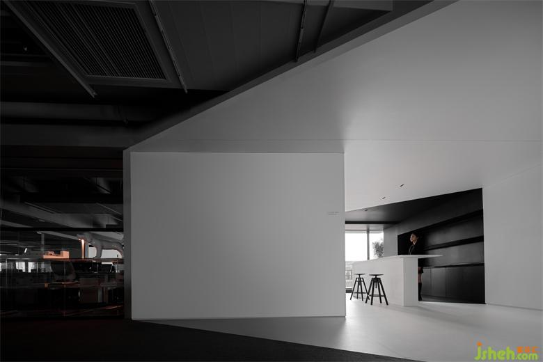 白色盒子的應(yīng)用,在這里并非只是單一的空間形式,它在公共辦公區(qū)通道的L形轉(zhuǎn)角前方,形成白色茶水間。