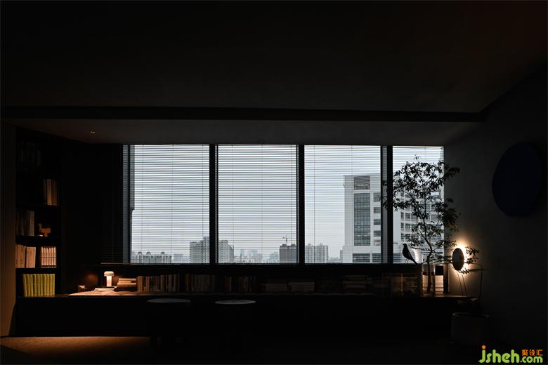 入口南窗這邊是以書柜、長凳、置物架、水平窗為高低布局的室內(nèi)小景;而鄰近美院校園一側(cè)的落地玻璃,則以更開放的方式將綠植、陽光引進室內(nèi),形成視覺延伸。