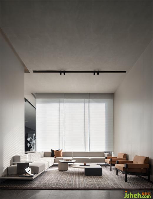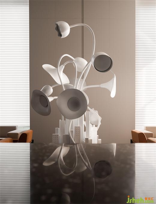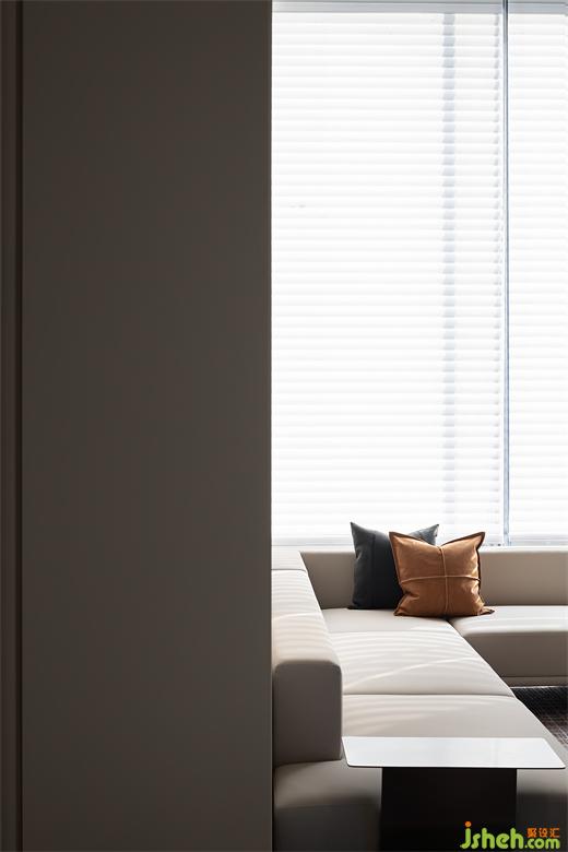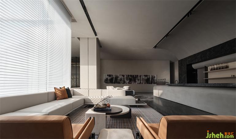 沙發(fā)座椅區(qū)位于沙盤(pán)與咖啡吧臺(tái)的對(duì)面,這里的空間重心開(kāi)始微微下移,巨大的玻璃幕墻在其后,投下溫暖和煦的光斑,一種安靜的情緒縈繞其間,暗示為某種柔軟的、可以安放心身的歸屬感。