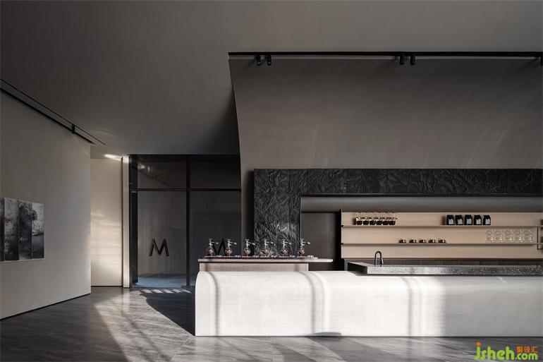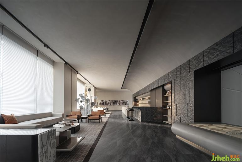 銷售中心設(shè)計(jì)從灰色的前廳進(jìn)入,整個(gè)空間平面疏朗平緩,區(qū)域的形成并不依賴確定性的邊界,更多是由空間的場(chǎng)景感所引導(dǎo)。