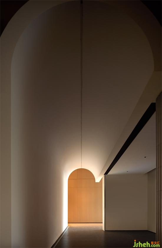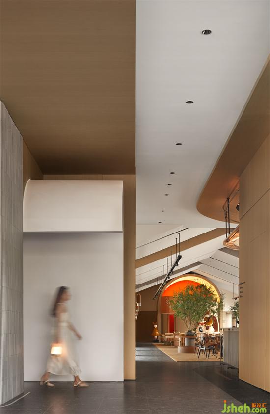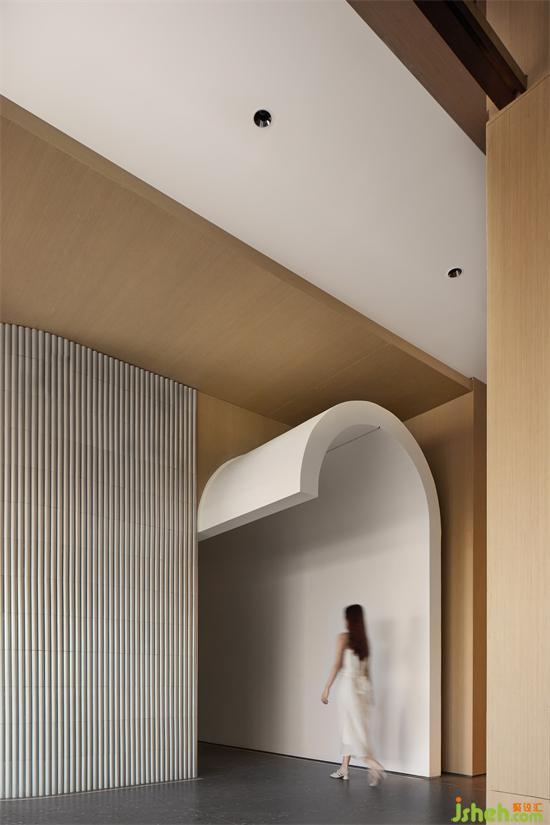 穿過沙盤區(qū),是一個(gè)進(jìn)深大的長空間,設(shè)計(jì)師順應(yīng)屋脊的形態(tài),在頂部采用層序疊進(jìn)的手法,銷售中心設(shè)計(jì)形成體積感,將視線收攏于中軸,黑色燈帶嵌于其中,溫暖樸素的木元素與幾何、線條語素完美結(jié)合,勾勒出空間的儀式與秩序。