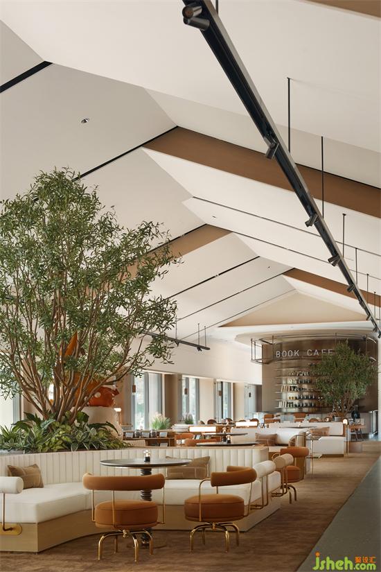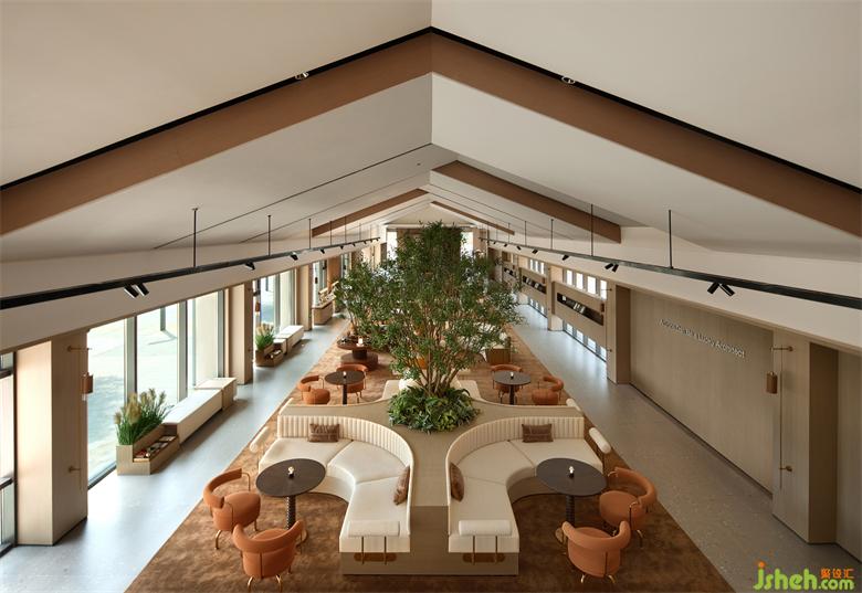 空間之中兩株直通頂部的樹形成了軟裝關(guān)系的中心,圍繞著兩棵樹,形成了各自的交談場景。銷售中心設(shè)計(jì)坐在其間,仿佛歲月穿梭,拉回到曾經(jīng)在樹下捉蟬,彈彈珠的時(shí)光??臻g與人、人與人的距離迅速被拉近、包裹。
