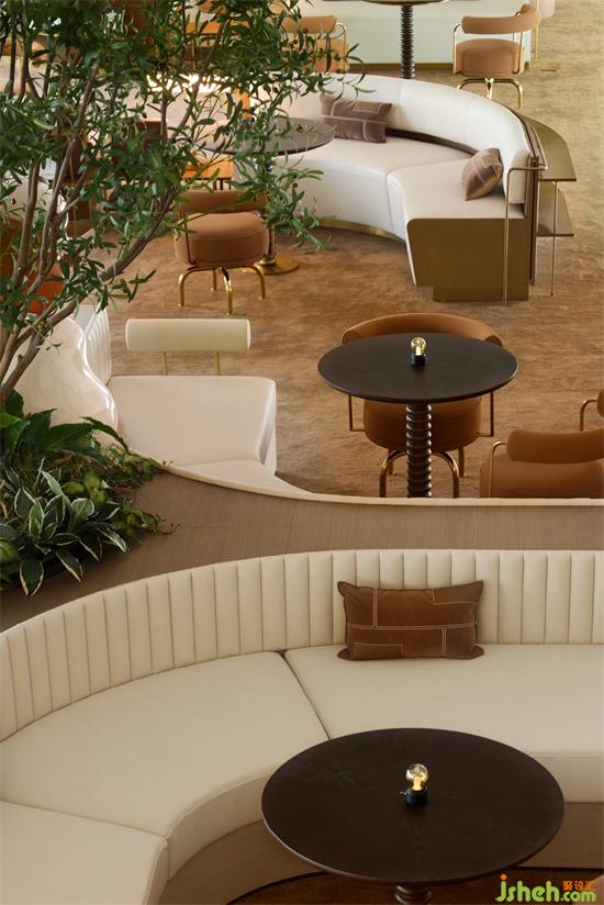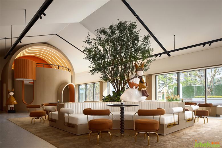 空間的秩序是幾何的,而內(nèi)部的關(guān)系組織卻多用弧形。銷售中心設(shè)計(jì)在長空間中,設(shè)計(jì)師設(shè)置了兩個(gè)節(jié)點(diǎn)——分別是圓形咖啡吧臺(tái),和“樹屋”兒童區(qū),讓這些功能模塊成為空間轉(zhuǎn)化關(guān)系的交叉點(diǎn),同時(shí)梳理空間秩序,完成不同場景之間的界面處理。