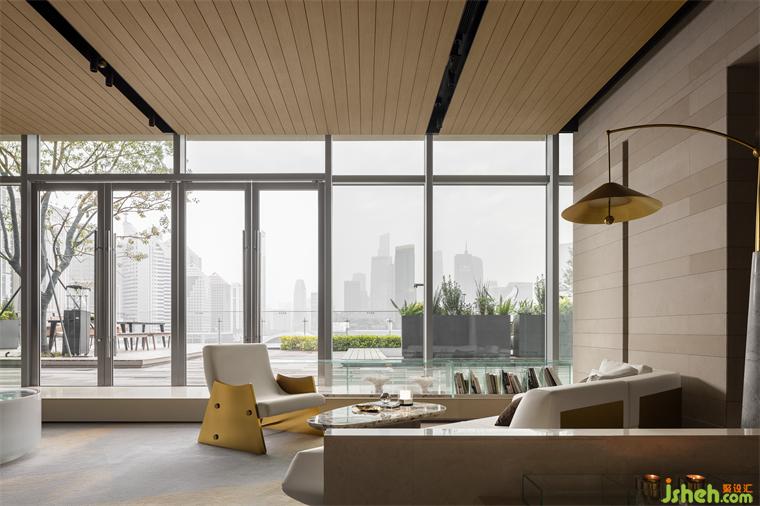 戶外露臺(tái)的設(shè)計(jì)圍繞樹與城市景觀,布置沙發(fā)座椅,構(gòu)造樹下多維社交集會(huì)空間。天際會(huì)所設(shè)計(jì)露臺(tái)式屋頂?shù)挠行н\(yùn)用,可以供人穿行使用,“屋頂平臺(tái)”就此誕生。如何聯(lián)系起屋頂平臺(tái)和室內(nèi)空間是設(shè)計(jì)的關(guān)鍵。
