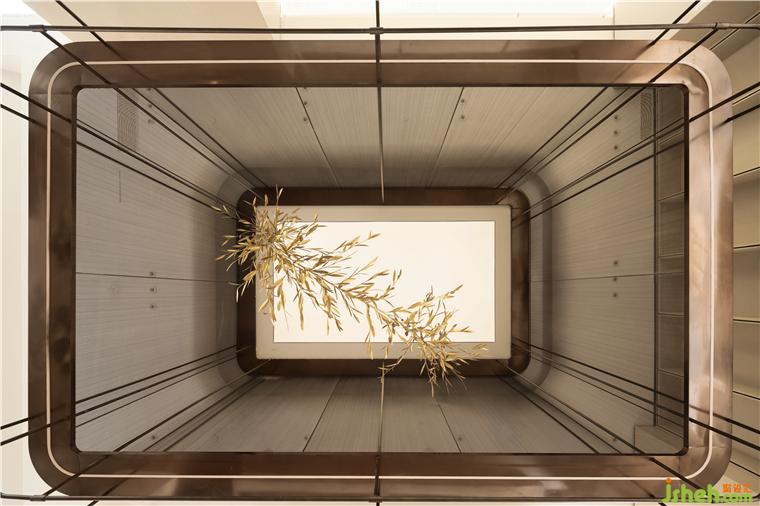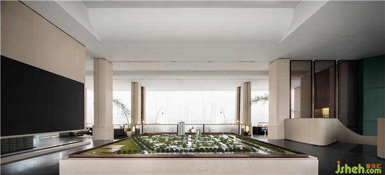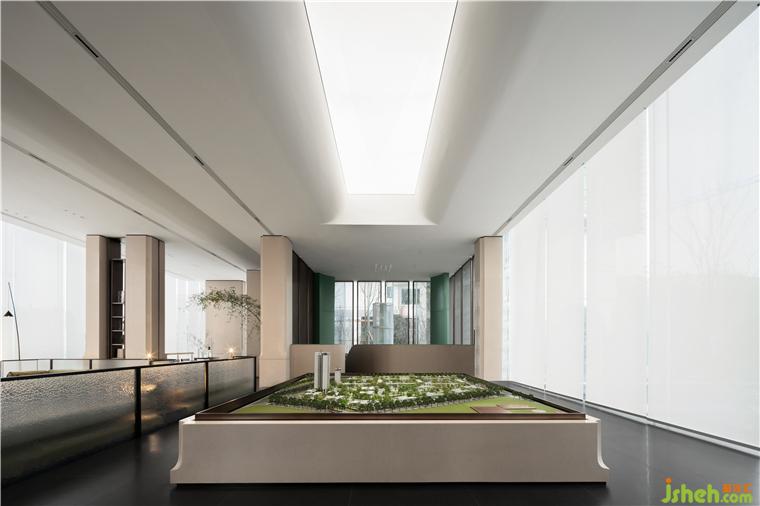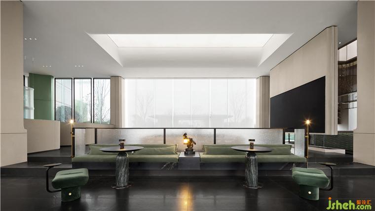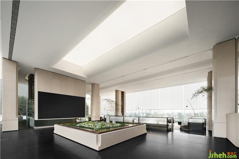 保利成都和頌售樓部設(shè)計空間上下共兩層,一層通過把不同的場景放置到空間之中以創(chuàng)造豐富的體驗感和游走的儀式感,二層通過錯落的地面標(biāo)高將室外湖景引渡進室內(nèi)視野,下沉區(qū)以中央景觀水池為中心形成內(nèi)向型圍合空間,有效凸顯項目價值點使得人的視線更加聚焦??臻g動線曲折迂回,整體布局靈活可變,為未來社區(qū)的生長留下更多可能性。