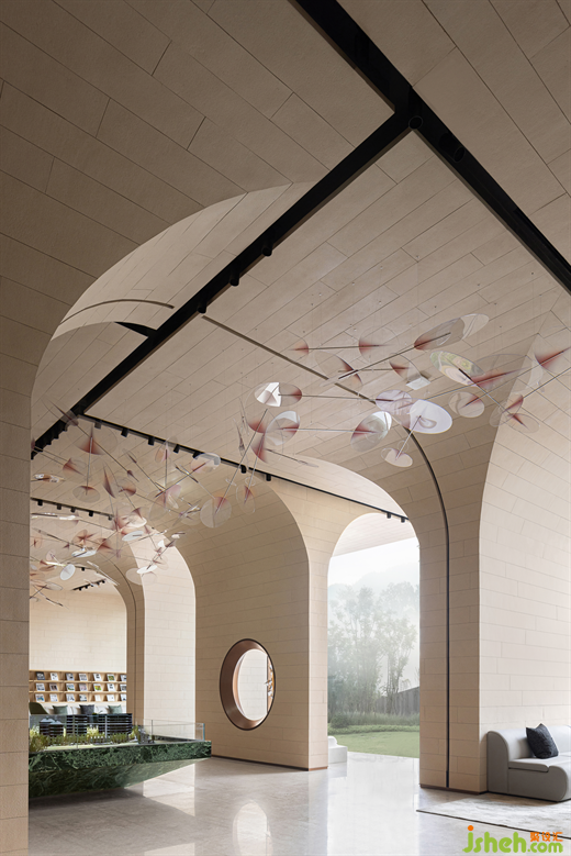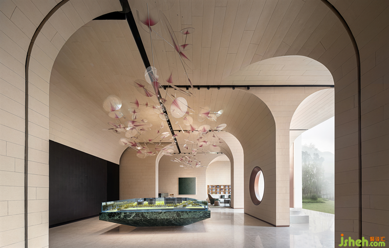 因此在概念上,由生態(tài)環(huán)境進行切入,提取出一系列貼切有效的自然元素,并充分結(jié)合原本場地為住宅架空層的原始條件,以“森林會客廳”為概念、以“林中漫步”為主體場景的售樓部,便成了最精準的空間意向性表達。