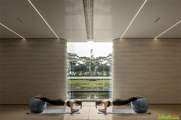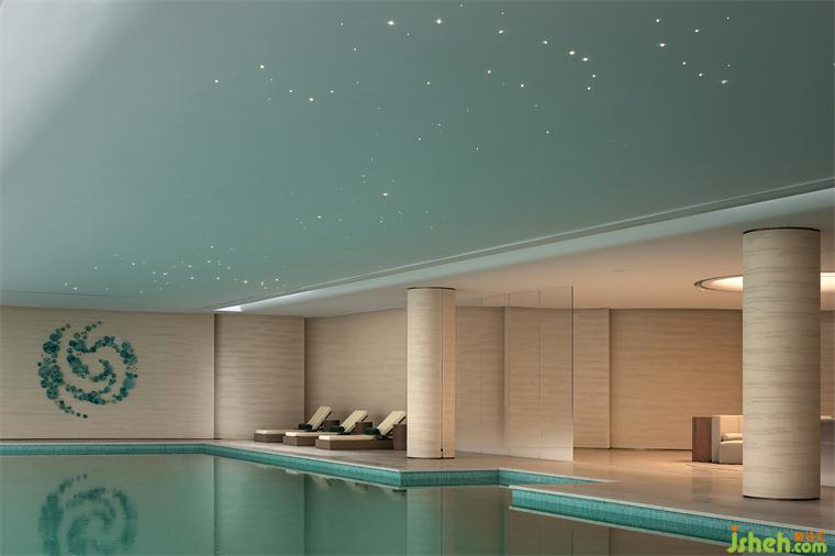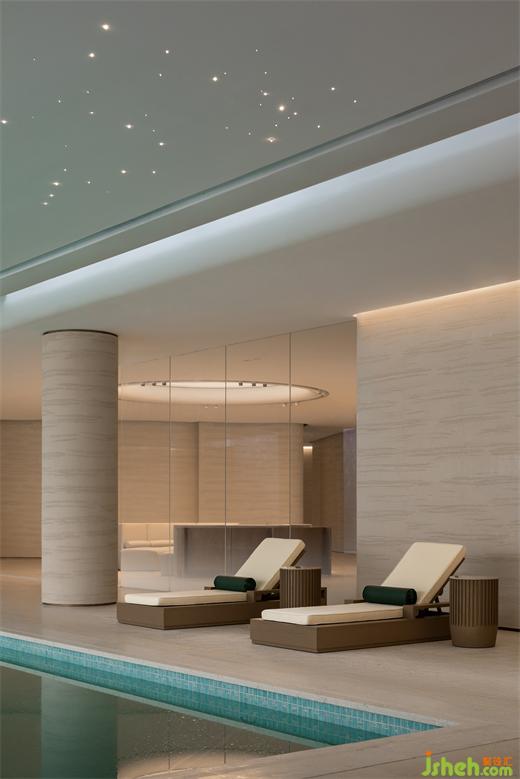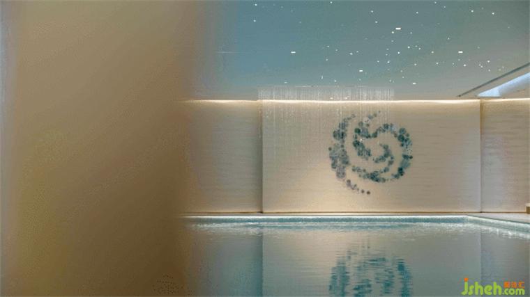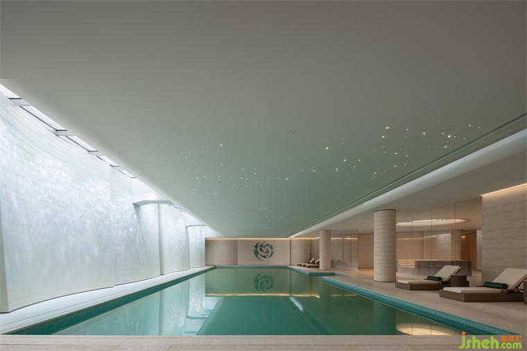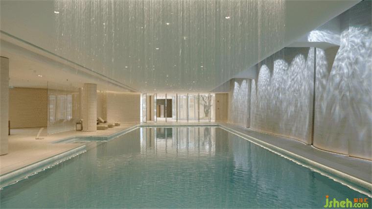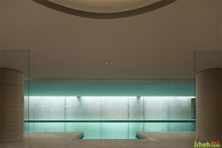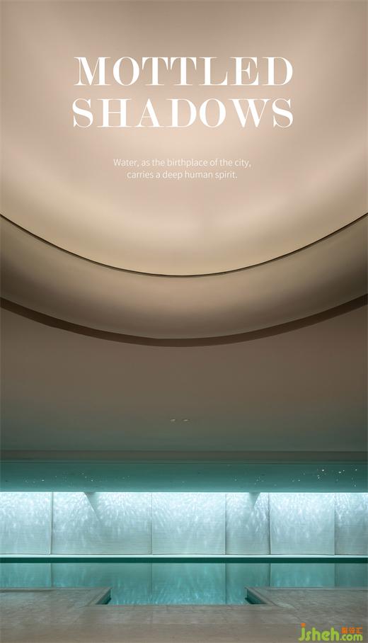 環(huán)繞泳池的墻面略帶起伏,與一層水景相結(jié)合的天窗在頂面和立面的交接處若即若離,自然光自此散射入空間,形成輕薄的帷幔。售樓處設(shè)計動態(tài)的光影結(jié)合墻面起伏的動勢,喚醒人們?yōu)I水的記憶。