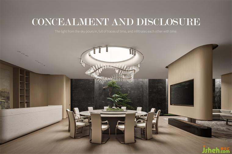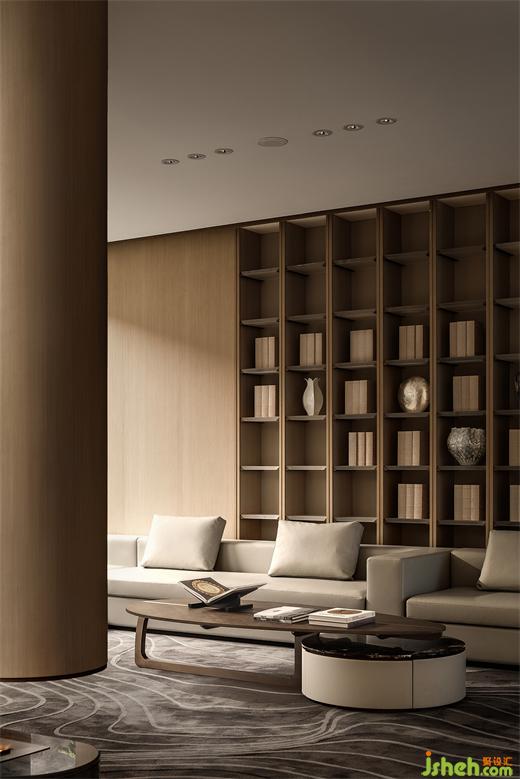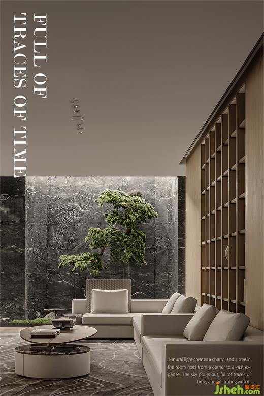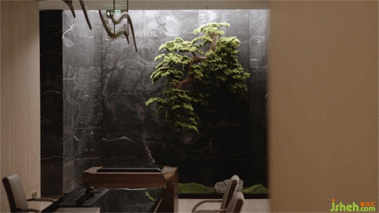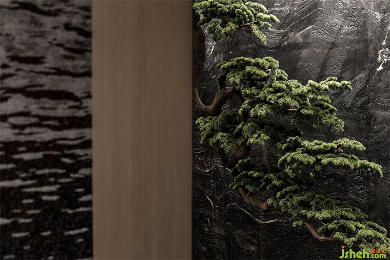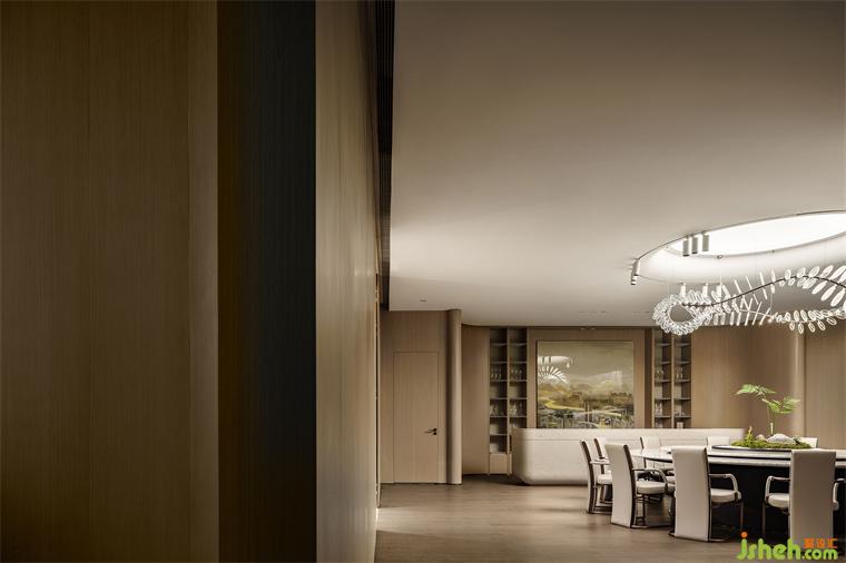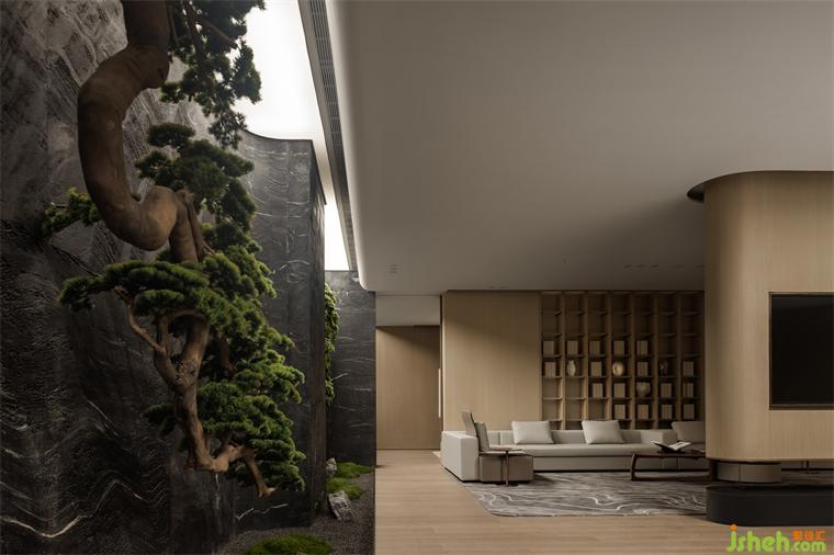 墻,在售樓處設(shè)計(jì)中占了很大的比重。與其說木質(zhì)墻面是一種被表現(xiàn)的對(duì)象。不如說它是一種體驗(yàn)的結(jié)構(gòu)和氛圍背景。如藏于山林之間,私宴區(qū)以木質(zhì)環(huán)繞的立面,藏著自然的生命意象。外透的自然光線營造出幽韻,室中一樹如溪出一灣,從一角而至廣袤。天光傾瀉,充滿時(shí)間的痕跡,與時(shí)間相互浸潤。