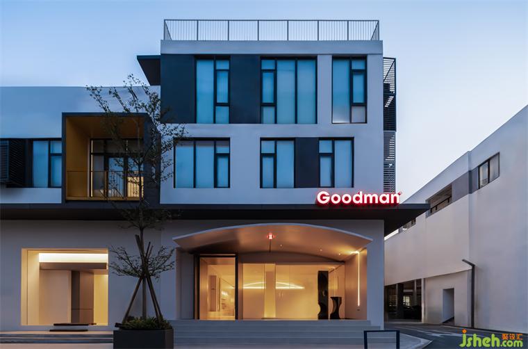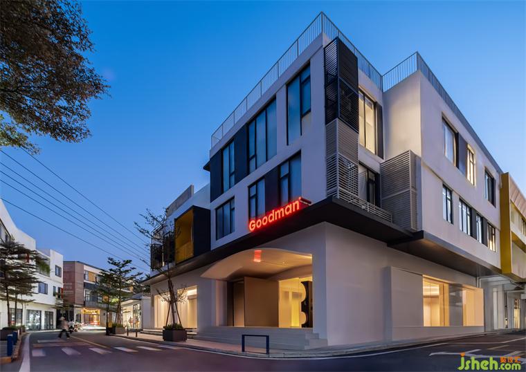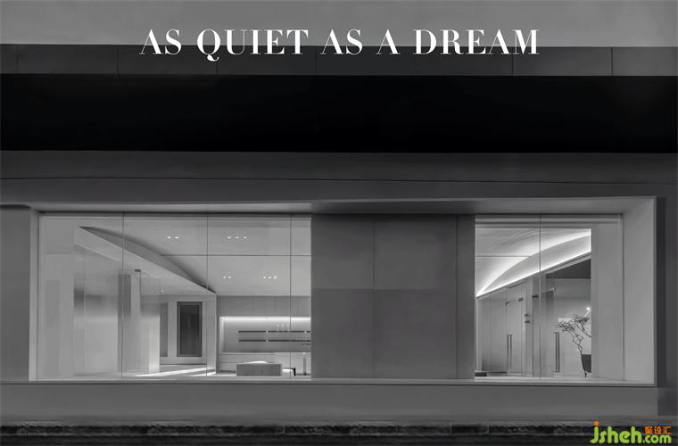 展廳側(cè)面面向園內(nèi)道路,大玻璃櫥窗的巧妙設(shè)計(jì),展廳設(shè)計(jì)把外立面的不利條件包裹,使室內(nèi)日與夜的不同氛圍如海報(bào)畫(huà)般隨時(shí)間流逝而切換呈現(xiàn)。此刻如隱歸于此,感受時(shí)光緩緩流轉(zhuǎn),如夢(mèng)恬靜。