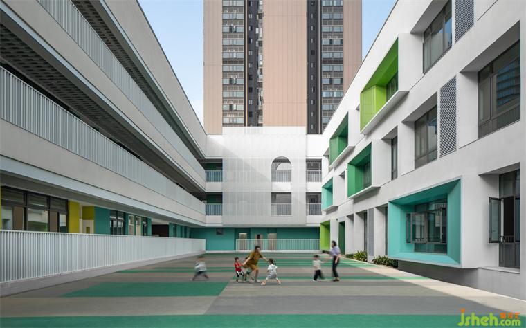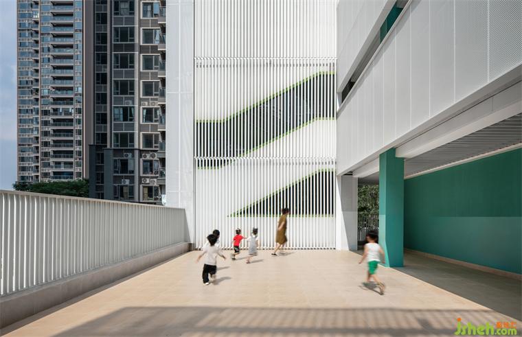 幼兒園外立面的設(shè)計,采用表皮包裹與局部改造相結(jié)合的手法,完成對搖籃概念的詮釋。金屬沖孔網(wǎng)的包裹,將各個建筑體塊、區(qū)域空間串聯(lián)起來,形成一個整體,增加空間內(nèi)外的流暢性與延續(xù)性。
