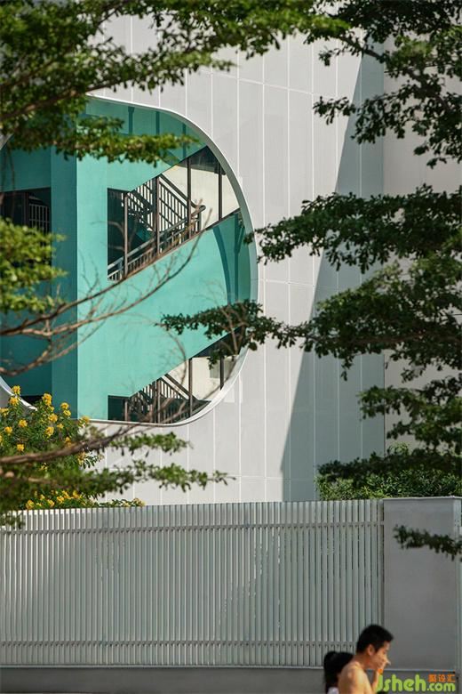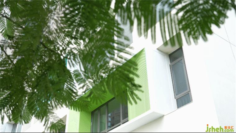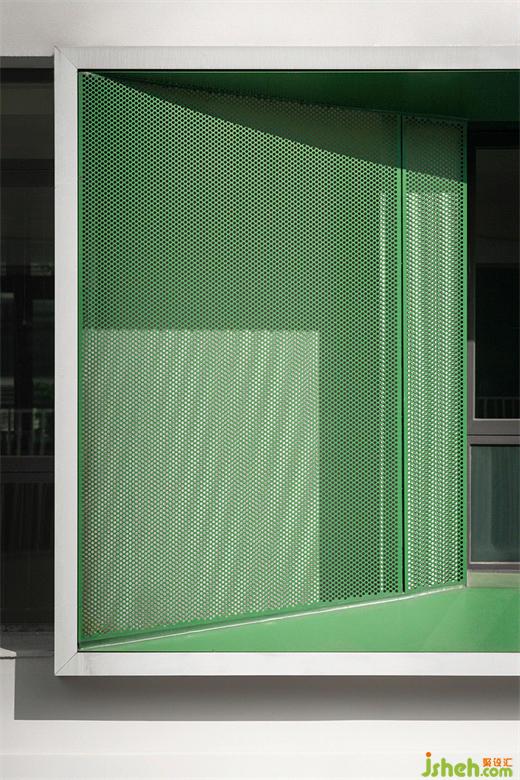 幼兒園設(shè)計金屬沖孔網(wǎng)如紗網(wǎng)一般,輕盈而具有呼吸感,既有效地遮蓋了原建筑結(jié)構(gòu)的缺點,又因空隙過濾著光的形態(tài),捕捉著光影的變化,而金屬沖孔網(wǎng)上挖出的圓與橢圓的造型,則更進(jìn)一步豐富了搖籃的具體形態(tài),并使之趣味盎然。