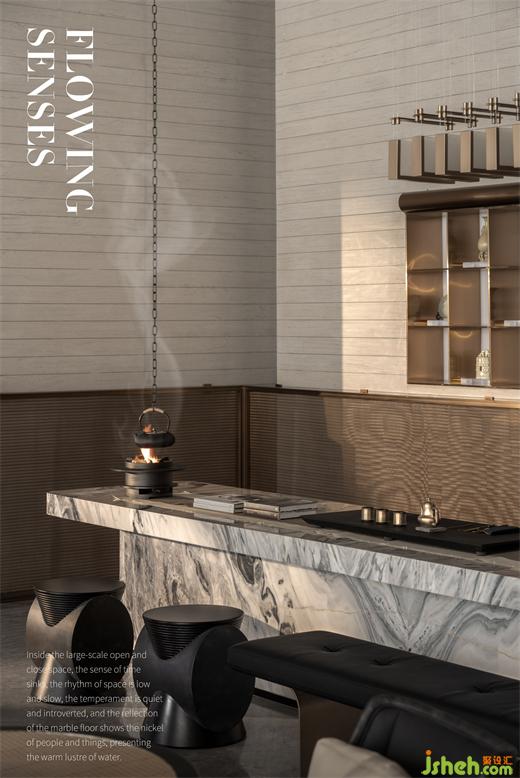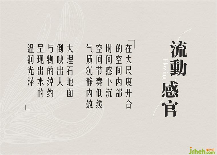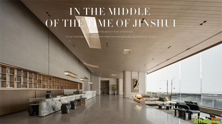 流動(dòng)的感官,流暢的布局。中央水景具象化了錦水漣漣的姿態(tài),成為整個(gè)售樓部視覺感知的中心。當(dāng)人們閑來獨(dú)踽、臨水而坐時(shí),仿佛又重新回到了那個(gè)從精神上依賴著錦水的時(shí)光之中。