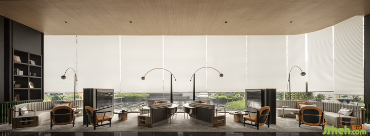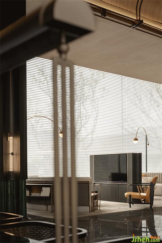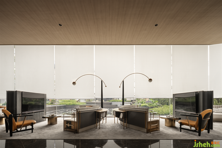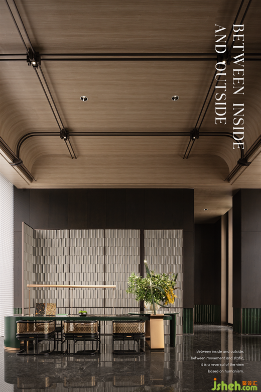 水吧區(qū)的背景在墻垣與帷幕的意向中,成為人與外部景觀的中介物,內(nèi)外之間、動(dòng)靜之間,售樓處設(shè)計(jì)是建立在人本主義基礎(chǔ)上的一種觀法的反轉(zhuǎn)。