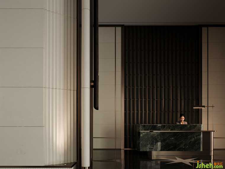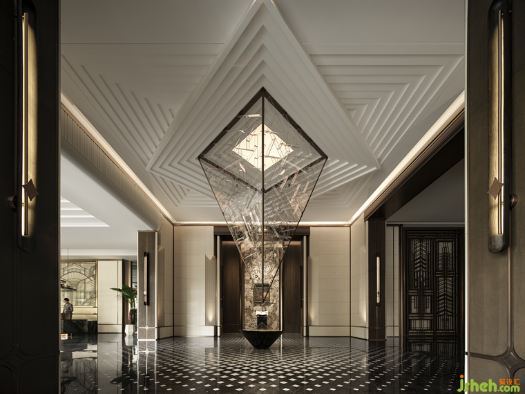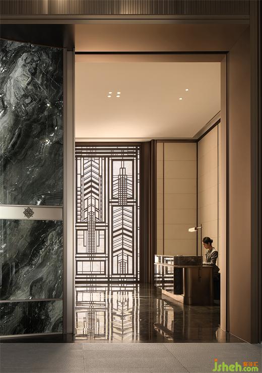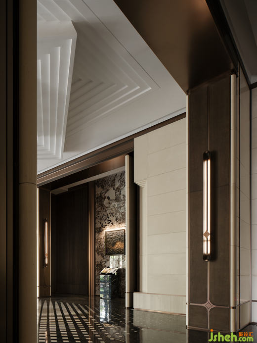序廳頂面,源自經(jīng)典Art Deco的硬朗線條形成視覺沖擊,潛意識(shí)中傳遞了一種典雅的秩序。地面石材紋樣同時(shí)形成一種噴薄的張力,將節(jié)奏與虛實(shí)、秩序與模數(shù)演繹得更加生動(dòng)。