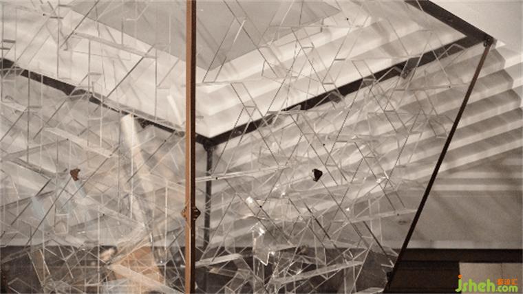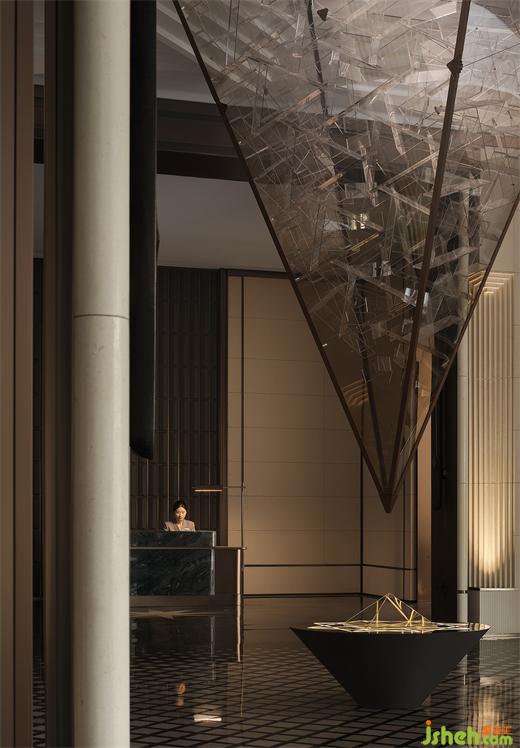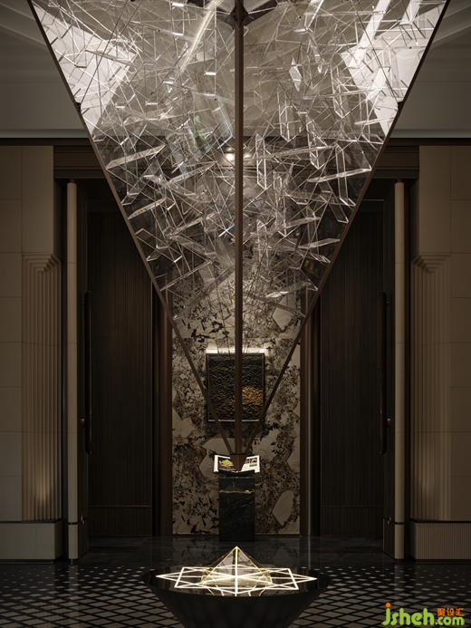 會(huì)所設(shè)計(jì)玻璃倒錐裝置以超驗(yàn)的姿態(tài)呈現(xiàn)在序廳中央。兩個(gè)椎體之間生成概念化的“點(diǎn)”,似有若無的坐標(biāo)摒棄了單一焦點(diǎn),讓空間彼此呼應(yīng),又有參商之闊。