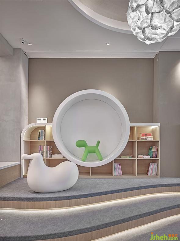 沙盤區(qū)的另一側(cè)是寓教于樂的兒童活動室,在弧形趣味的書墻造型下,運(yùn)用意大利家具品牌ME TOO與LEGO結(jié)合,童趣而不失爛漫。