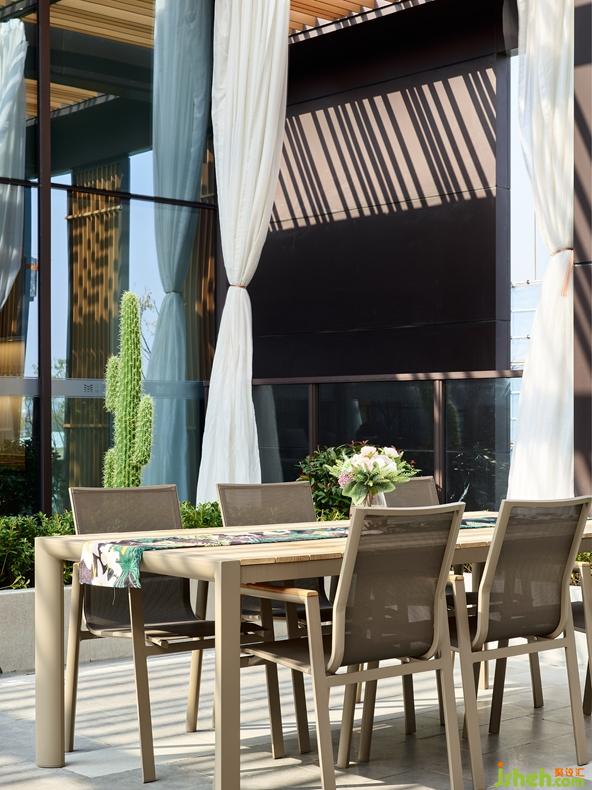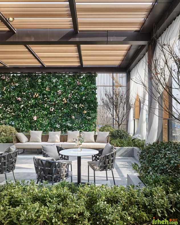 進(jìn)入二層映入眼簾的是通透溫馨的太太廚房,長條的開放式操作臺便于烘焙與交流,使整個(gè)空間互動且活潑。半透明墻面上的女性形象涂鴉充滿活力,張揚(yáng)且突出主題,簡潔的線條配合花卉裝飾,給予當(dāng)代女性全面的詮釋和表達(dá)。走出戶外,一片生機(jī)盎然的景象是野獸派花園的陳列。這個(gè)半開放式空間由遮陽頂與紗簾為邊線,戶外沙發(fā)套組的背后是一整面花草墻,與三五好友在此喝個(gè)下午茶聊聊天,雅致而沁心。