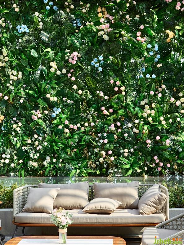 As arriving at the second floor, an open kitchen leaps to the eyes first. The long kitchen island helps housewives to bake and communicate freely, which facilitates interactions and ensures a lively atmosphere within the space. The visually striking graffiti on the translucent wall depicts a contemporary female with clean lines, which highlights the theme of the space and well coordinates with the flowers near it. Outside the kitchen is a pleasing garden, which presents a vibrant scene. This semi-open space is edged with a canopy for a canopy and gauze curtains. An outdoor sofa set is placed in front of a wall with flowers and grasses, which enables people to enjoy afternoon tea and chat with friends in an elegant and refreshing environment.