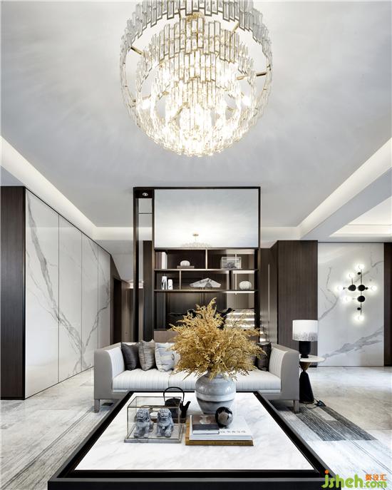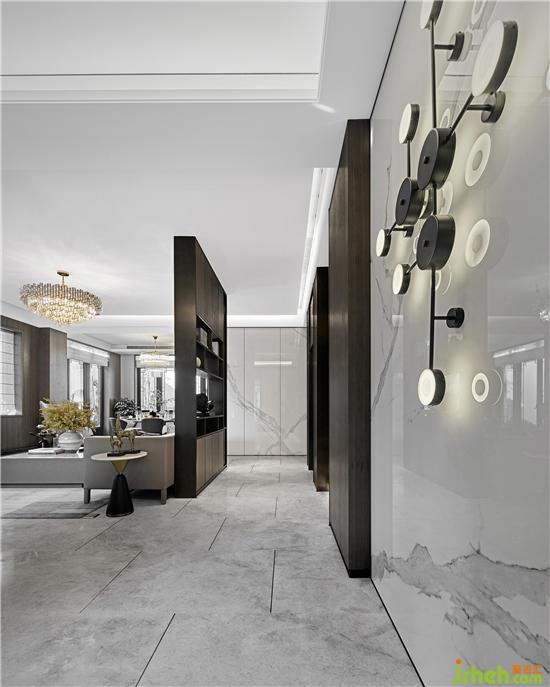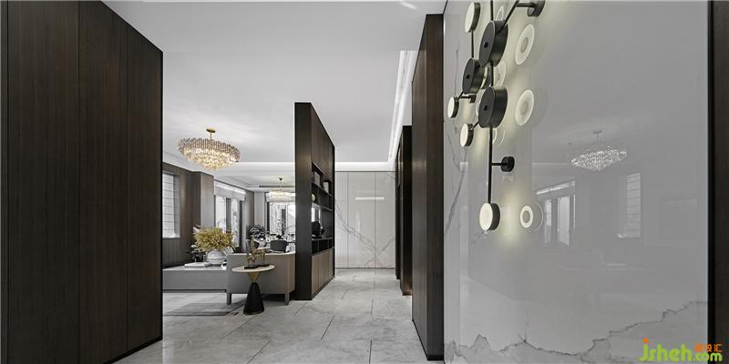 主要材料:云多拉灰,爵士白、仿古銅不銹鋼,黑胡桃染色拉絲木飾面,仿魚肚白巖板,藝術(shù)玻璃