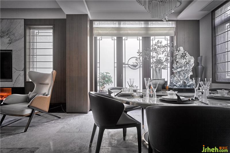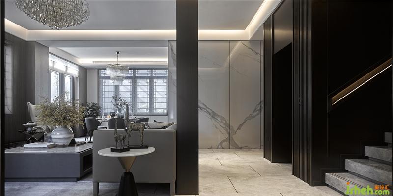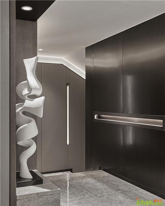 餐廳與廚房間的拉門不落俗套地以啞光仿古不銹鋼鑲邊,規(guī)則磨砂肌理的藝術(shù)玻璃為飾面,含蓄內(nèi)斂。而條紋狀仿古銅不銹鋼同樣運(yùn)用于電梯過(guò)道墻面,暗穩(wěn)的光感悠韻深邃。別墅樣板房設(shè)計(jì)