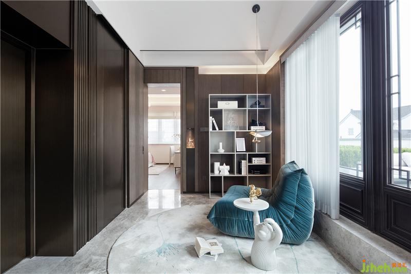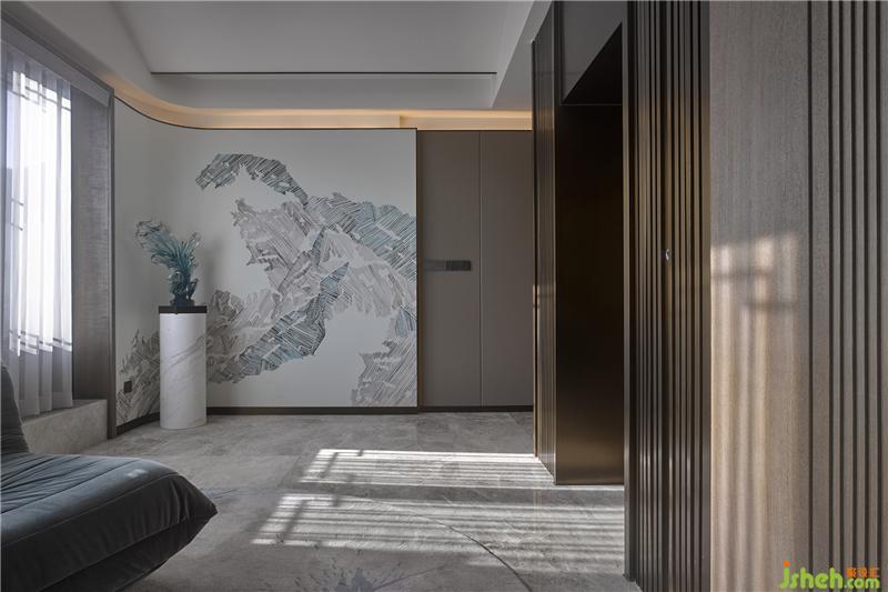 走上樓梯,私密的臥室空間隱藏于此。主臥窗明幾凈,寬敞舒怡。春江綿山閑亭聚的悠奕景象依附床頭墻上,剩余墻面則選擇弧形布藝硬包,意味深遠(yuǎn)。