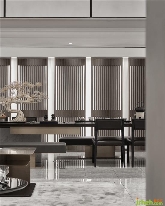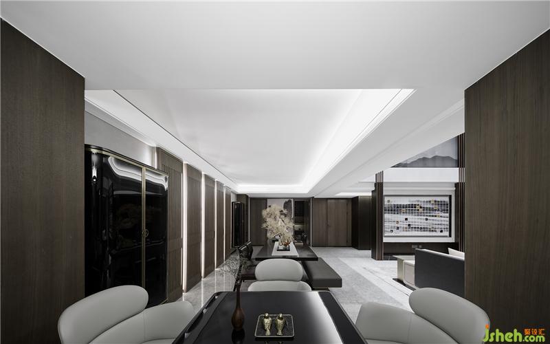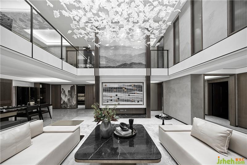 聚會(huì)區(qū)與棋牌區(qū)在夾層書房的下方,山水做題,青松寫意,猶如山居長卷中的閑然筆觸,皴法了了,情趣怡然。別墅樣板房設(shè)計(jì)