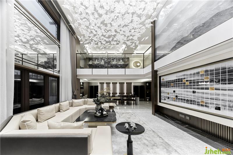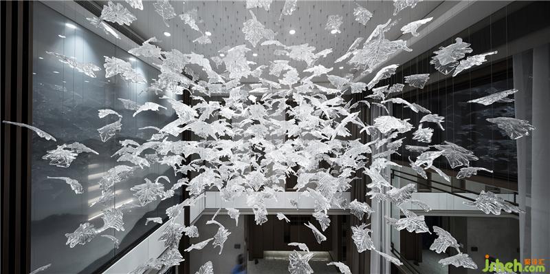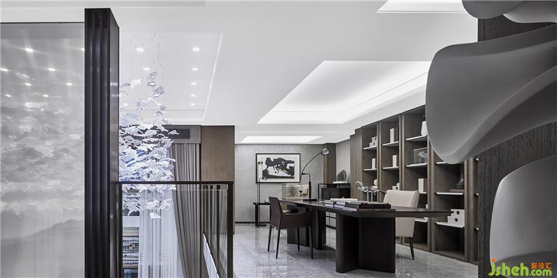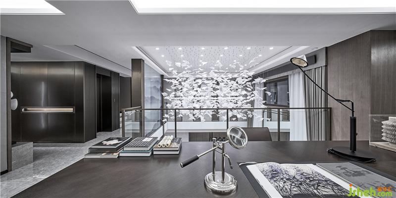 從客廳向下,樓梯上的云多拉灰大理石將客廳的娓娓雅清連接于此。走道安有山水紋藝術(shù)玻璃,延續(xù)著溫婉意境,心悅神怡。月影逐光的書房在地下夾層一端,閑默的格調(diào)為屋主辟置一處獨(dú)享空間。護(hù)欄外,吊頂散落而下的透明葉片,以無拘的現(xiàn)代語言詮釋自然,宛若天成。