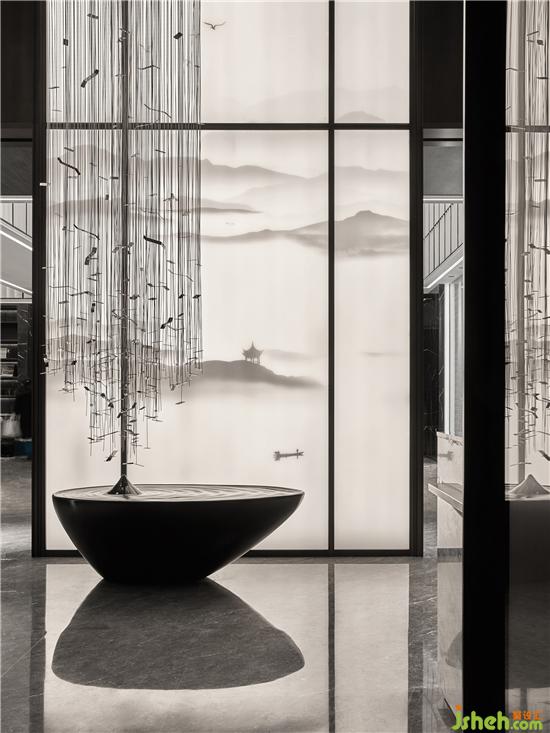 超白夾絹玻璃映襯出一幅“浮萍破處見山影,小艇歸時(shí)聞草聲”的悠然畫卷。光線從吊頂波紋不銹鋼的邊緣沿線條垂流而下,凝固在水滴漣漪的藝術(shù)裝置上,使人走入其間,如與自然共棲,相得益彰。會(huì)所設(shè)計(jì)
