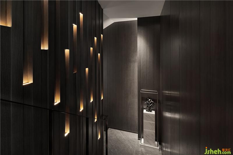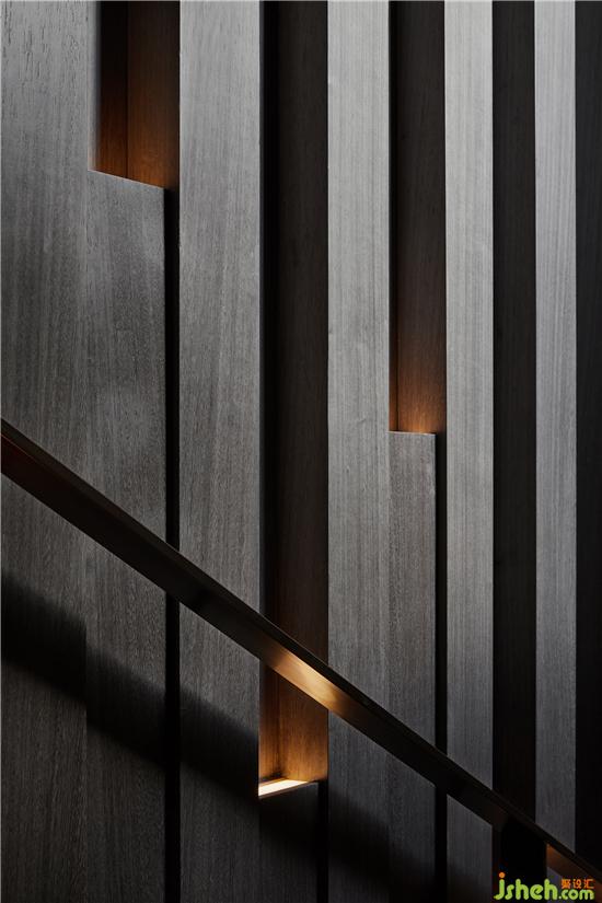 木飾面立方體交錯拼接而成的墻面占滿樓梯一側空間,光束沿著內(nèi)凹體塊循序漸變,歷史的厚重感不言而喻,這是光與空間共造的藝術。會所設計