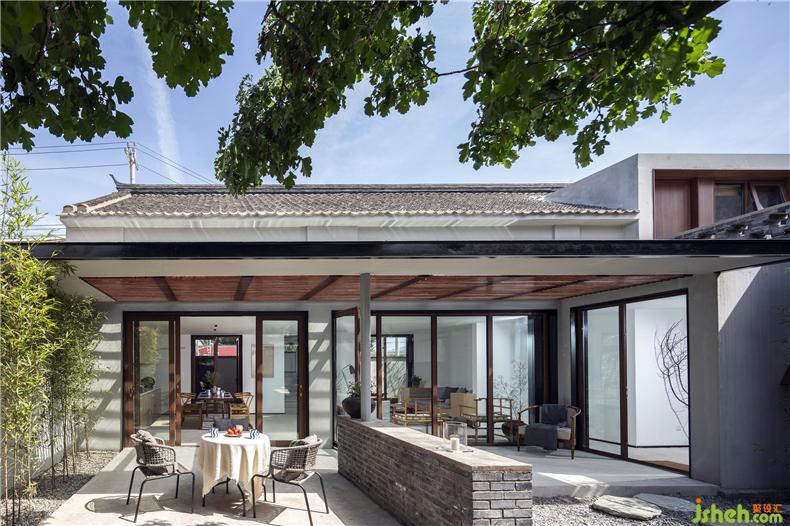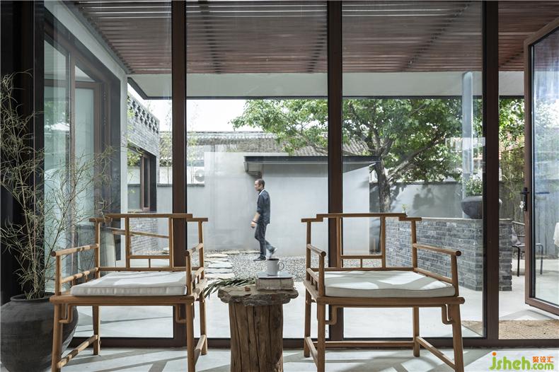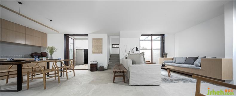 為了實(shí)現(xiàn)庭院視覺的穿透性和連貫性,建筑師以大面積玻璃作為首層南北立面的主要材料,置身室內(nèi),可觀春華秋實(shí)、晨昏霧靄,聽雨打石板地的清脆聲響,讓自然風(fēng)光成為生活風(fēng)景。而這種開放又與院外相隔,充分保障了居住空間的私密性,室內(nèi)設(shè)計(jì)師這也是對傳統(tǒng)民居內(nèi)向性審美的一種延續(xù)。