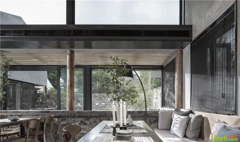 為了滿足商業(yè)屬性空間應(yīng)有的尺度感與使用靈活性,建筑師將坐北朝南的主體建筑加高至兩層并做了通高處理,容納室內(nèi)就餐活動(dòng)?!袄认驴臻g”由“紅果樹(shù)”延續(xù)至此,滿足半室外就餐的需求。而庭院之中,室內(nèi)設(shè)計(jì)師暖色編織質(zhì)感的沙發(fā)椅圍合出一種歡聚的氛圍,水泥花壇里野蠻生長(zhǎng)的綠植、竹子與石墻面為近景,矮山與藍(lán)天為遠(yuǎn)景,讓就餐的氛圍更加“原生態(tài)”。