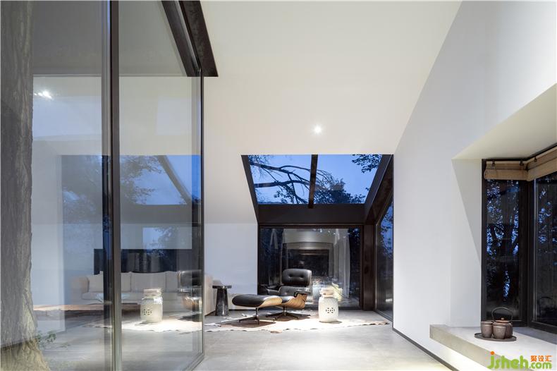 根據(jù)場地地形,東側(cè)的連廊設(shè)于-1.4米標(biāo)高位置,并創(chuàng)造了新的屋脊高度。民宿設(shè)計(jì)地形高差借勢增加了室內(nèi)的凈高,在新建筑部分,利用這處增加的高度,設(shè)計(jì)師設(shè)計(jì)了一間位于二層的臥室和一間擁有閣樓的親子書房,為不同的家庭結(jié)構(gòu)的使用者提供了自由選擇。而在北側(cè),公共空間由傳統(tǒng)建筑的外殼脫胎,蔓延至新的“金屬盒子”。室內(nèi)設(shè)計(jì)師內(nèi)庭院將場地原有的植株保留下來,環(huán)繞它們布置了客廳與茶室。透過大面積玻璃窗,庭中枝椏躍入眼簾,營造出樹下生活的愜意生活場景。民宿設(shè)計(jì)