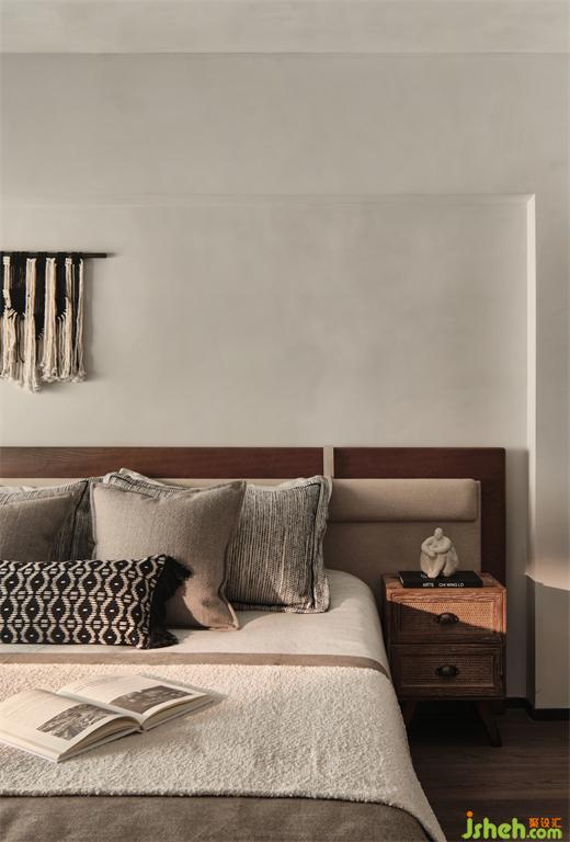 好的居住體驗(yàn)離不開(kāi)全時(shí)段的關(guān)照,回歸舒適柔和的臥室語(yǔ)境,人們向往更加私密、不被打擾的狀態(tài).在臥室空間中,民宿裝修設(shè)計(jì)以更細(xì)膩溫暖的奶茶色統(tǒng)領(lǐng)基調(diào),加入更多的棉麻和陶器的溫潤(rùn),在輕盈的二層空間營(yíng)造出屬于個(gè)人的心靈港灣.