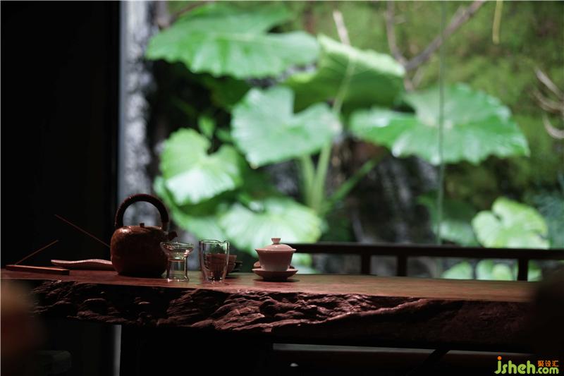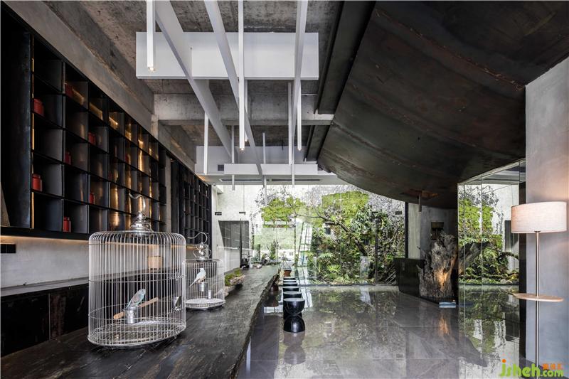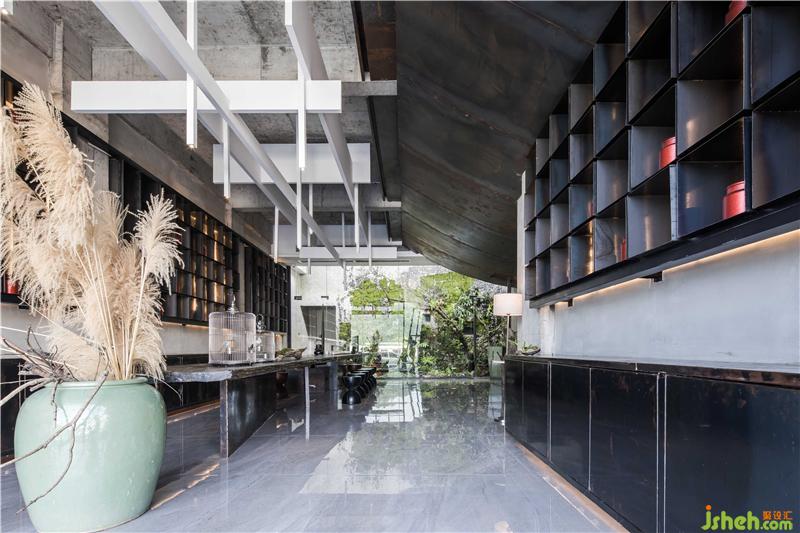 山間霧里·文化餐館的觀景位置絕佳,由于面朝風(fēng)景名區(qū),在設(shè)計的過程中餐館摒棄了大面積的墻體創(chuàng)作,選擇鋪設(shè)成塊的平面玻璃以觀湖色。落地大玻璃借景入色,外部自然的光影云色投射,也為空間增添一份不同的體驗。用餐時見那山湖相擁,綠意盎然,無論與友人共食還是一人獨坐,都舒適感倍增。餐館的輪廓是一個不規(guī)則的線性空間建筑,除一個可容納多人的中廳之外,還有一個近乎封閉條狀空間,外臨墻界,只能由內(nèi)部通行。在設(shè)計過程中,通過改變桌椅的放置和角度的調(diào)整,以寬敞的過道劃分區(qū)域成為不同的空間,使每個空間都有不同的細(xì)節(jié)感受。竹簾遮蔽強(qiáng)光,使照入的自然光更加柔和,也起到照明的作用。頂部矩形條狀燈嵌入球狀竹條編制裝飾,相互交錯,為室內(nèi)空間點綴了一些巧妙地趣味。濃郁的客家文化融入地道的客家美食,菜色豐富,味道鮮美。在湖景之畔領(lǐng)略不一樣的風(fēng)味人情。