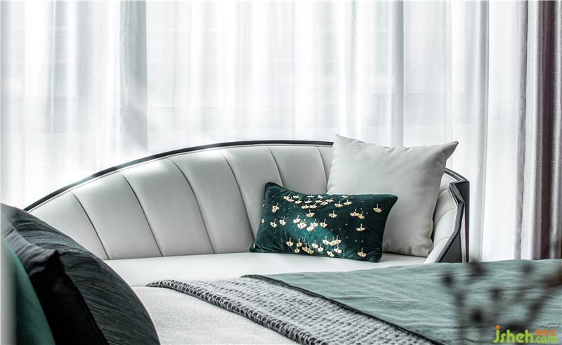 少則不及,多則繁雜。設(shè)計(jì)師摒棄了過(guò)多的元素堆砌,創(chuàng)設(shè)性地在居住空間點(diǎn)綴水綠色,為空間添加一抹奪目耀眼的明媚?!按簶遣婚]葳蕤鎖,綠水回連宛轉(zhuǎn)橋”,水綠色的運(yùn)用更是使墻的邊界變得無(wú)限模糊,窗外景色與室內(nèi)設(shè)計(jì)自成一景,江風(fēng)輕語(yǔ)入夢(mèng)來(lái),春水共庭院一色。