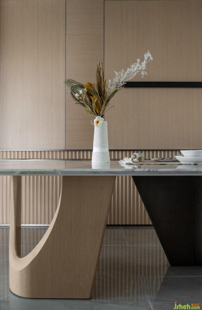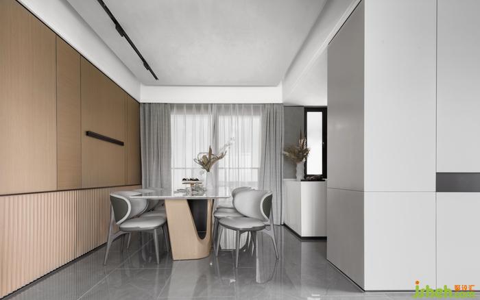 餐廳的功能承載了家庭成員共同相處的大部分時間,展開生活的無限可能。設(shè)計師以直線構(gòu)建空間的秩序感和簡明利落的格調(diào),以大面積灰色調(diào)鋪陳出主要的氛圍,餐椅的生理曲度弧線和皮質(zhì)舒適質(zhì)感,在細節(jié)之處傳達著生活中儀式感。樣板房設(shè)計